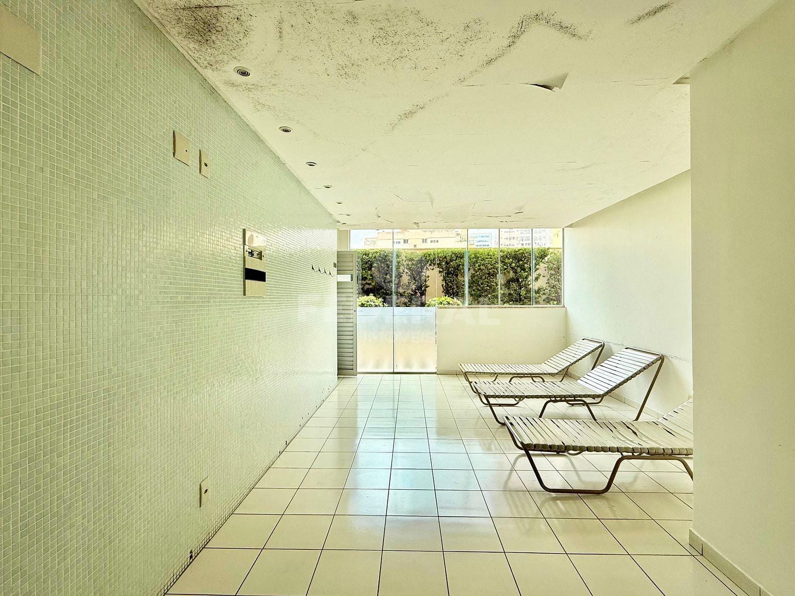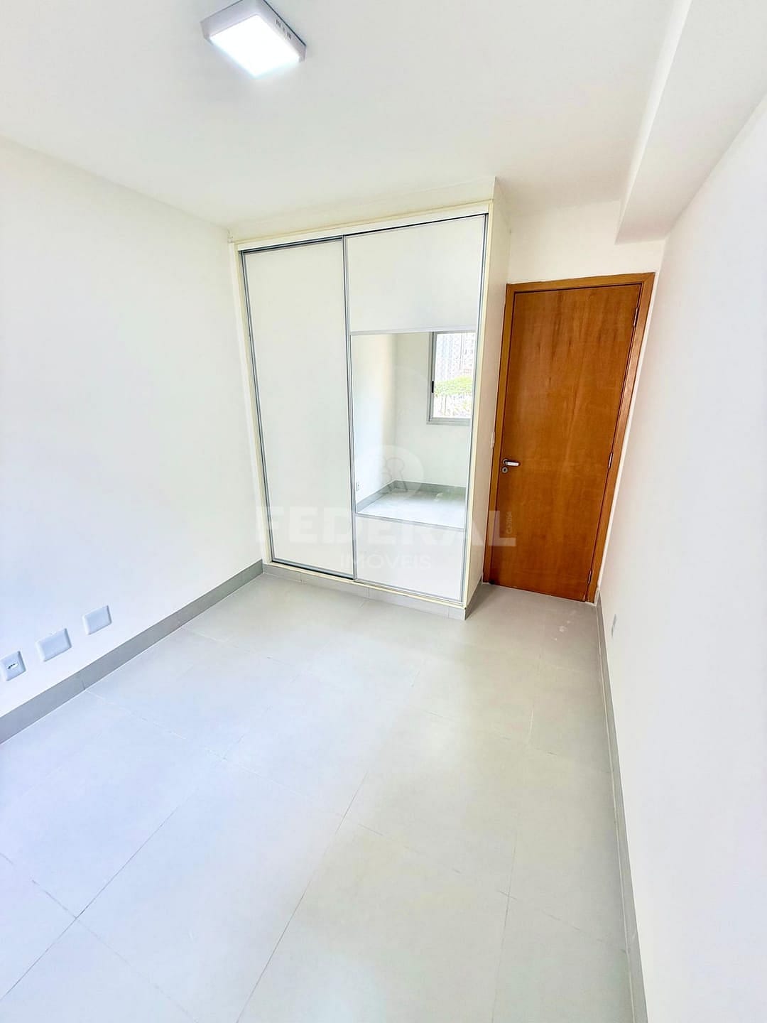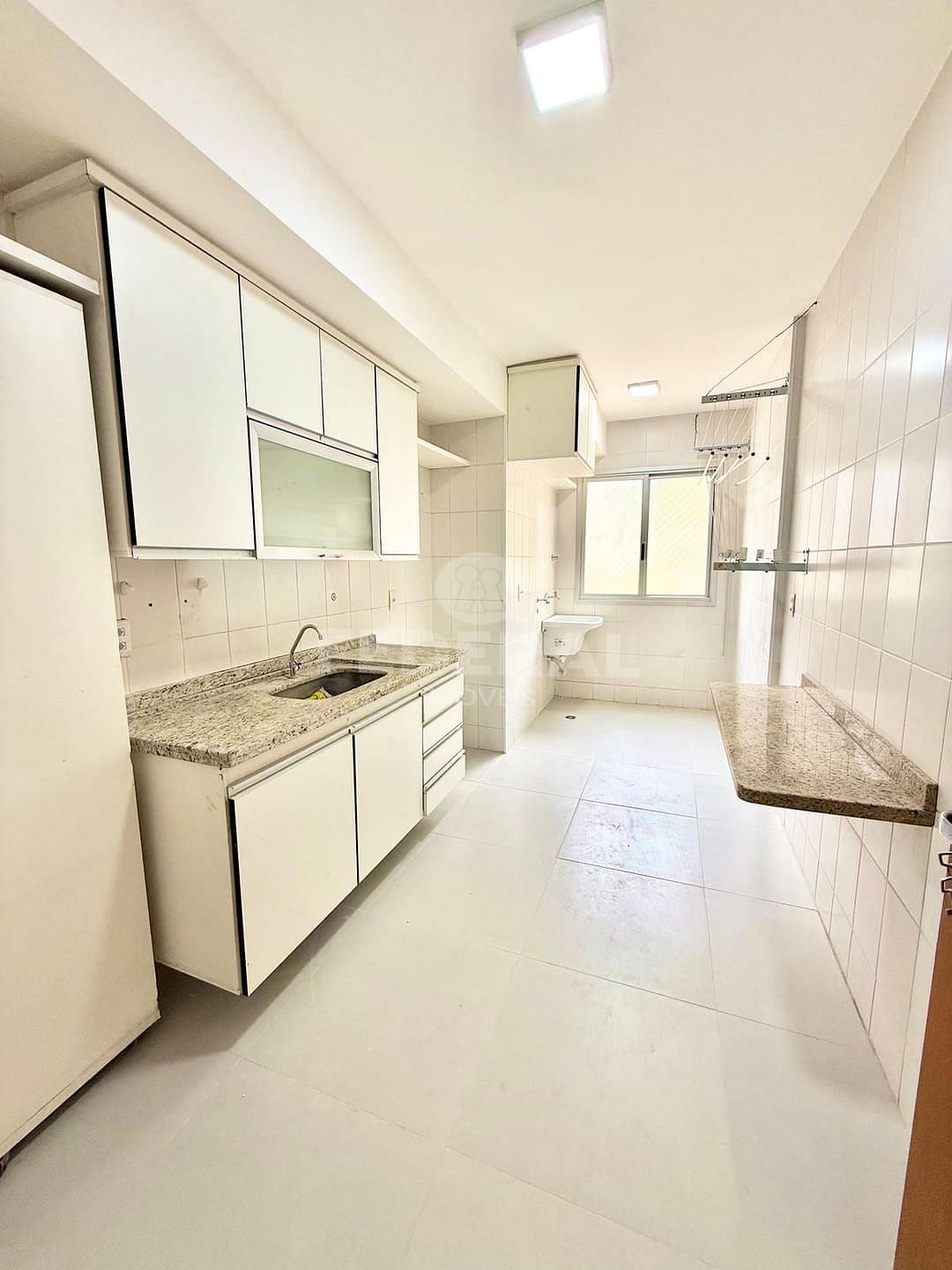 A unidade conta com 2 banheiros, 1 sala e uma cozinha equipada com armários. As dependências possuem piso de porcelanato e armários embutidos nos quartos e banheiros, garantindo praticidade e otimização do espaço.