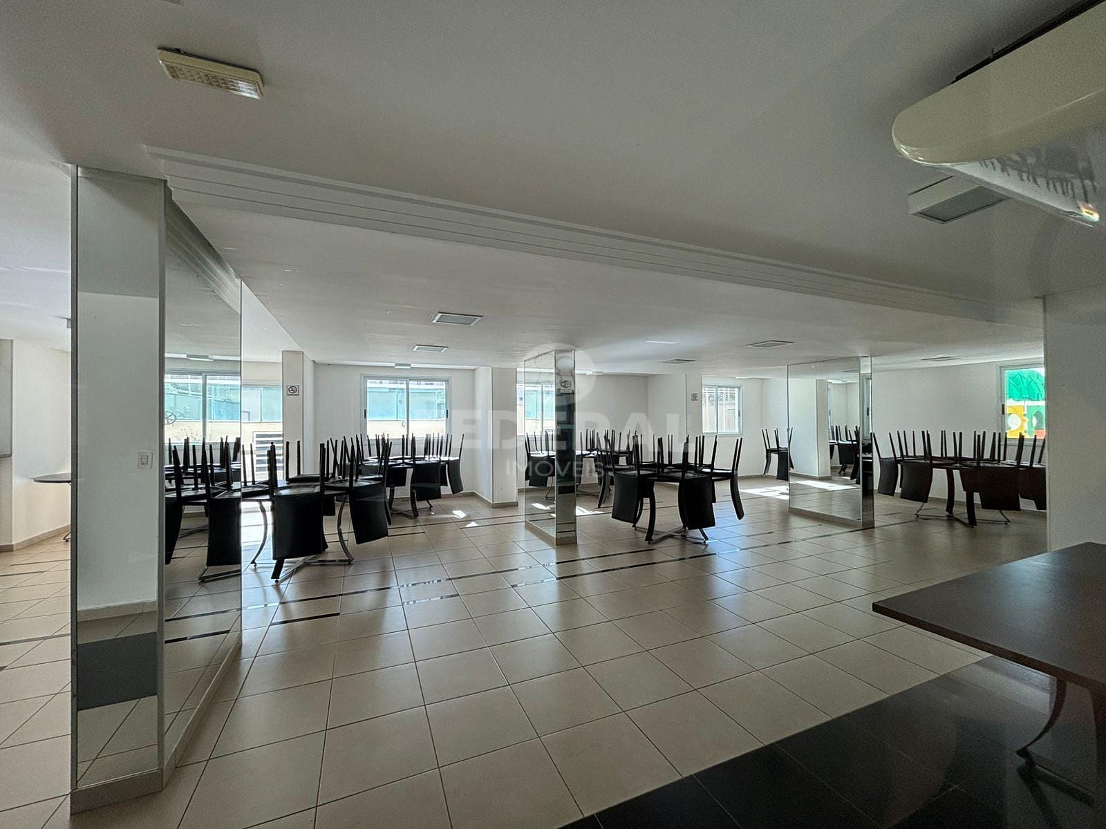 Área de lazer com piscina, salão de festas e academia.